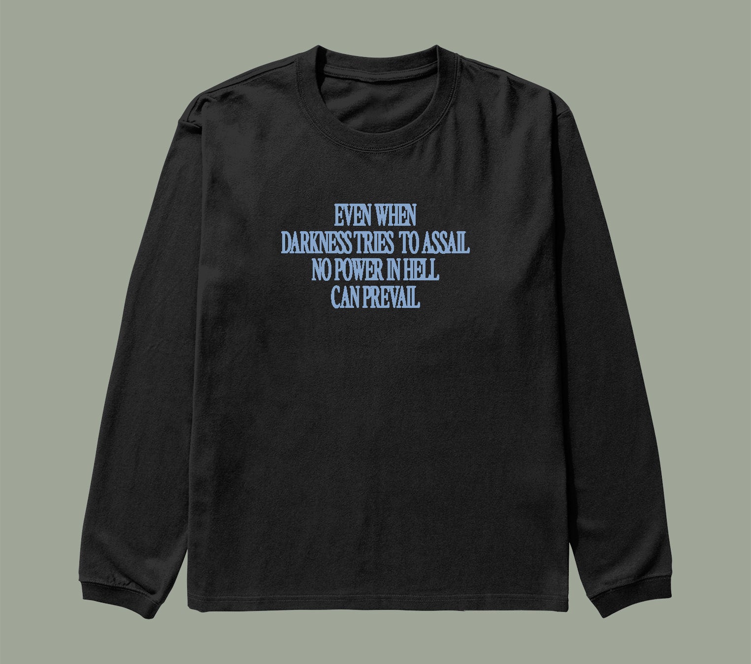 Black long-sleeve shirt with blue lettering of lyrics from the song "What the Law Could Never Do"